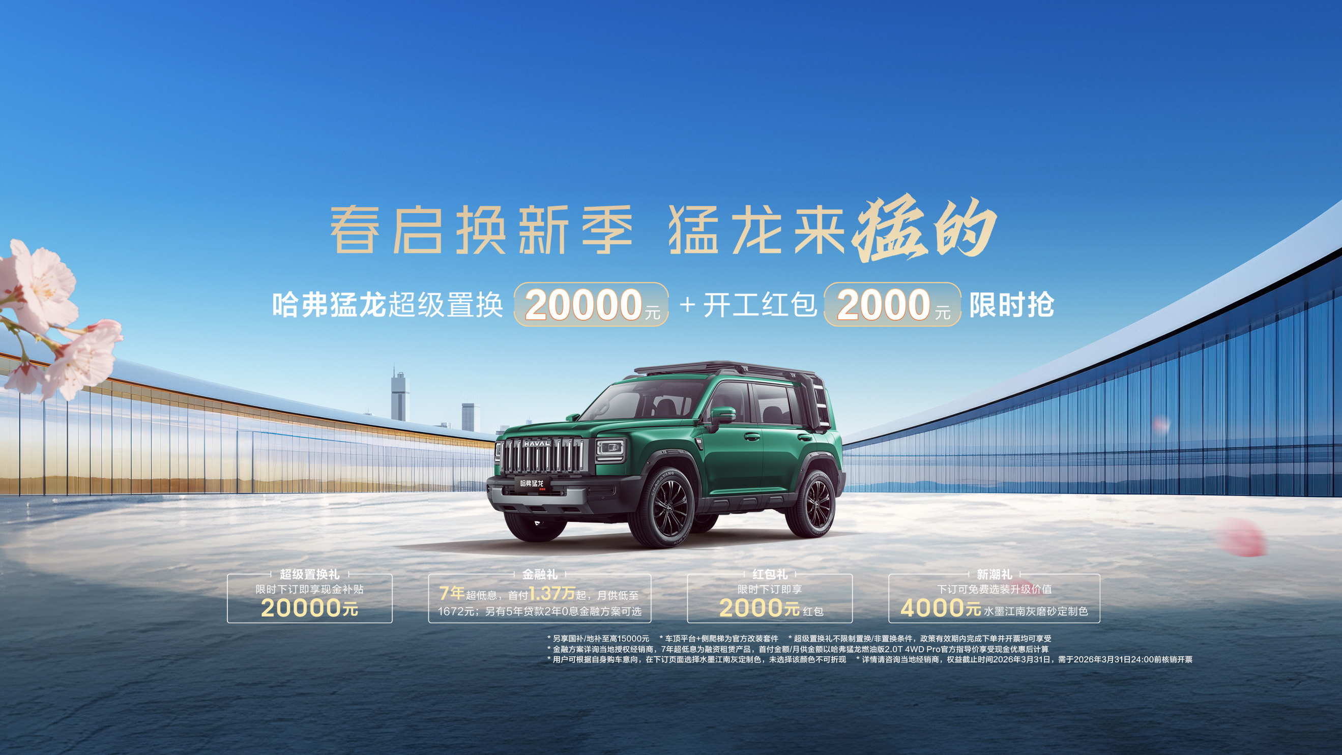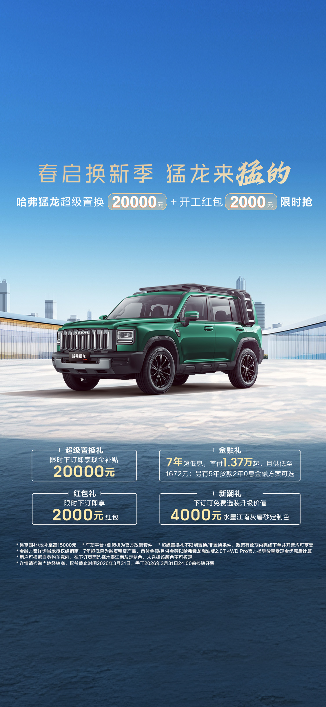 ②金融方案详询当地授权经销商,7年超低息为融资租赁产品,首付金额/月供金额以尊时凯龙猛龙燃油版2.0T 4WD Pro 官方指导价享受超级置换礼后计算;